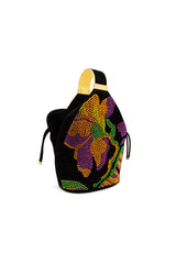 A modern interpretation of a 1930's Bienen Davis bracelet bag, the Kit bag features a 22K gold-covered, hand-dipped, molded brass handle, over 5,000 multicolored Swarovski crystals and removable interior drawstring bag with chain link shoulder strap.