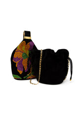 • Removable interior drawstring bag in suede with detachable chain link shoulder strap